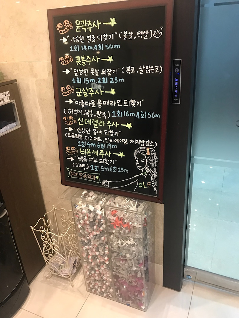 入り口には大量のヒアルロン酸とボトックスの使用済みのシリンジやバイアルが。普通は捨てるものですがディスプレイになっています!